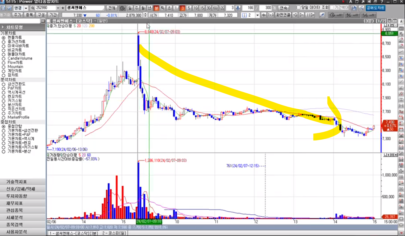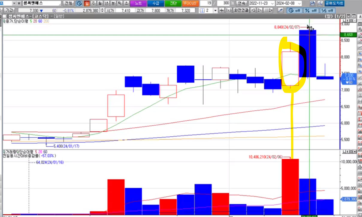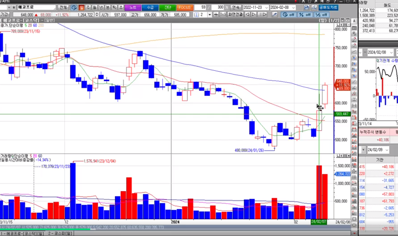 이건 좋아하는 자리였는데 안 함, 거래량 1,000만 터지고 역망치 좀 나왔는데 시간 외에서도 상한가 넣다 뺐다 더러워서 안 함. 2/6 외국인, 기관 양매수였는데 외국인들은 단타성이 강해서 갭이 많이 뜨면 던질 수도 있다는 예상을 해야 함.