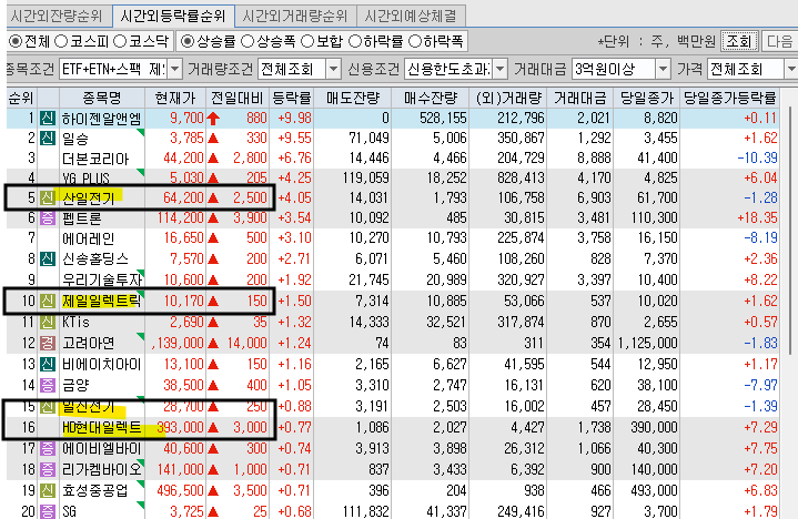 오늘 기준의 시간외 거래에서는 전기 변압기 관련 테마가 강세를 이룬거 같아보이는데