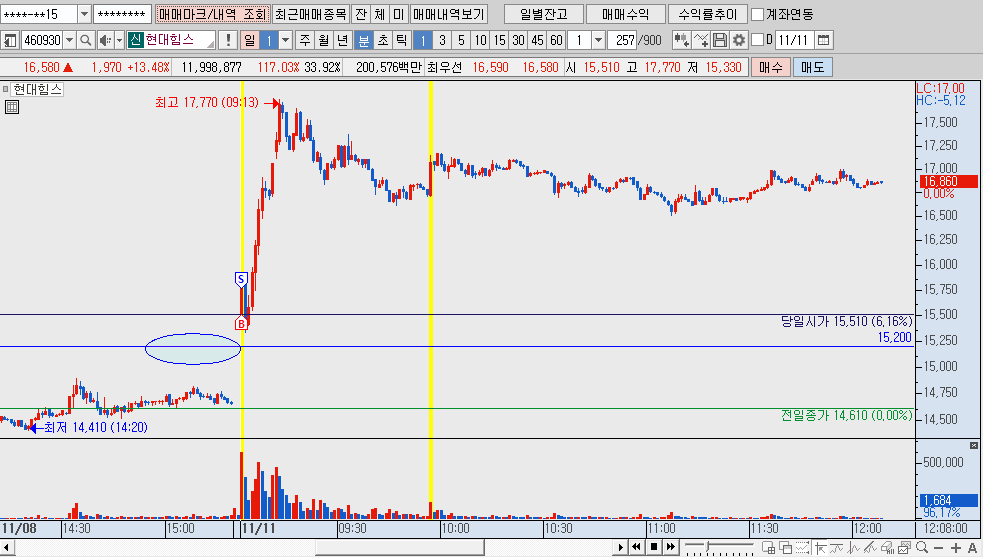 파란색 표시 가격에서 매수를 했고 장 초반에 살짝 내려오길래 추가 매수를 했습니다.